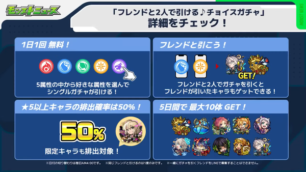 オーブを消費せずに、5属性の中から好きな属性を選んでシングルガチャが引ける!モンストのフレンドと2人で一緒にガチャを引くと、フレンドが引いたキャラクターもゲット!